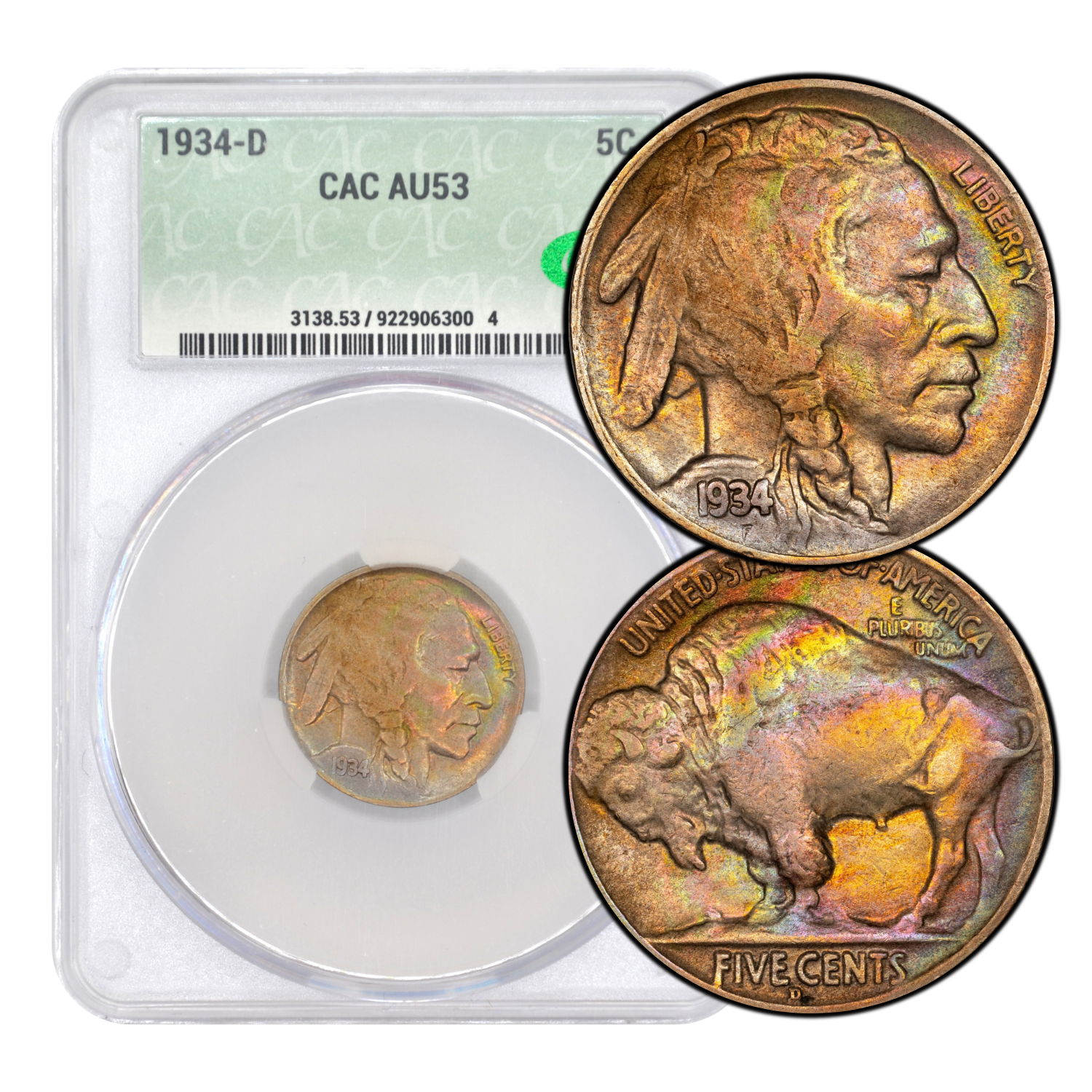 — Online Store — Categories: All Cents Wheat Cents Memorial + Shield Cents Nickels Liberty V Nickels Buffalo Nickels Jefferson Nickels Dimes Seated Liberty Dimes Mercury Dimes Roosevelt Dimes Quarters Seated Liberty Quarters Standing Liberty Quarters Washington Quarters Half Dollars Commemorative Half Dollars Walking Liberty Half Dollars Franklin Half Dollars Kennedy Half Dollars Dollars Morgan Dollars Peace Dollars Modern Dollars American Silver Eagles Odd Denominations World Coins Paper Money All Cents Nickels Liberty V Nickels Buffalo Nickels Jefferson Nickels Dimes Quarters Half Dollars Dollars Odd Denominations World Coins Paper Money 1934-D 5C Buffalo Nickel CAC Graded (CACG) AU53 - Lovely Dual Sided Toning $172.95 1938-D/S Buffalo Nickel PCGS MS65 (Overmintmark FS-514) Gorgeous Rainbow Toning $412.95 1936 Buffalo Nickel PCGS MS63 - Lovely Dual Sided Rainbow Toning $189.95 1938-D/S 5C Buffalo Nickel PCGS MS66 (Overmintmark FS-512) Lovely Toning $285.95 1938-D/S Buffalo Nickel PCGS MS66 (Overmintmark FS-512) Gorgeous Rainbow Toning $362.95 1938-D 5C Buffalo Nickel PCGS MS66 - Stunning Dual Sided Toning $503.95